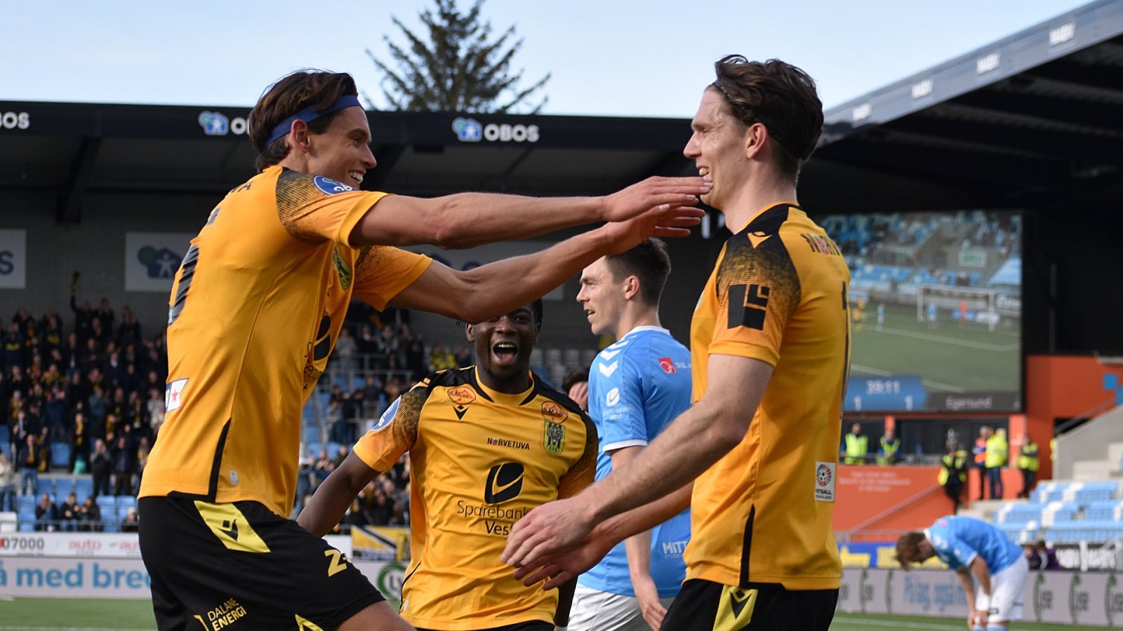 Ingvald Sandvik Halgunset omfavnes av lagkameratene etter overtidsscoring hjemme mot Start. Ingvald sørget for at EIK vant 3-2 etter en av mange snuoperasjoner under Kjell Andrés ledelse. Foto: Kjell Åvendal.