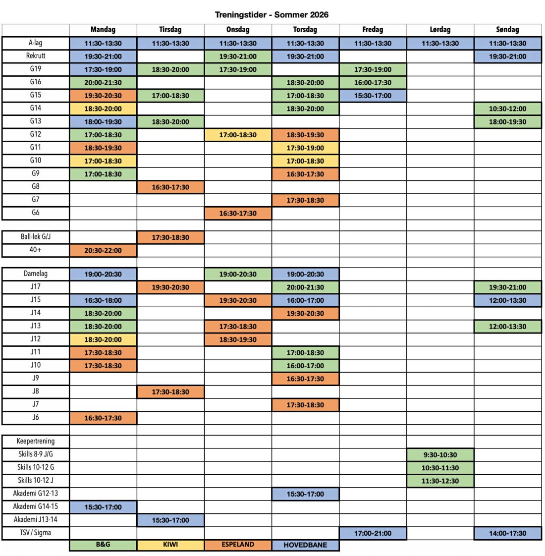 Under finner du treningstider, men husk å sjekke kampoppsettet (ligger lenger ned på siden) for hver uke da enkelte treninger blir flyttet fra uke til uke.